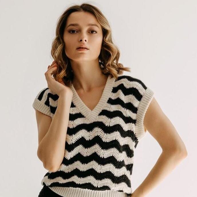 Le Gilet Jasmin, un véritable petit bijou créé en Suisse et crocheté à la main au Pérou, avec notre motif fleurs Jasmin .